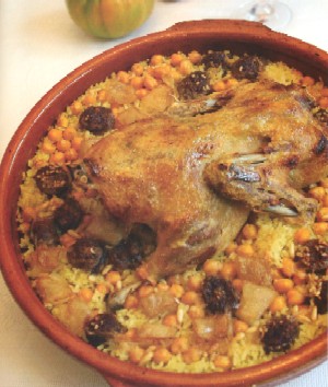 En una cazuela plana de barro, pondremos el arroz y el caldo, en proporción doble de volumen de caldo que de arroz, añadiéndole los blanquets troceados, el tocino picado, los garbanzos hervidos y los piñones.