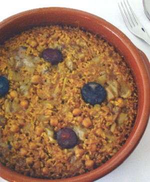 En una cazuela de barro, pondremos aceite y sofreiremos bien troceados el ajo y el tomate con una buena cucharada sopera de pimentón, y cuando estén a punto, añadiremos el arroz, los garbanzos, la pata, los chorizos y las morcillas.