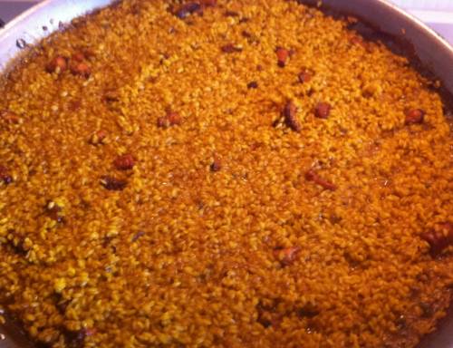 Se calientan dos tacitas de aceite en una paella o en una cazuela, se sofríen los ajos y se retiran, se añade el arroz y a fuego lento se va moviéndolo hasta conseguir el color dorado.
