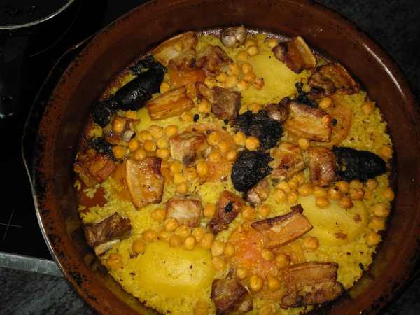 Extendemos el arroz uniformemente en la cazuela y colocamos sobre él las costillas de cerdo y algunas mollitas (trozos) de la carne del cocido, el chorizo y la morcilla (píncheles la piel para que no revienten y se esparza por todo el arroz), la patata en rebanadas gruesas, unos cuantos garbanzos y, como colofón, unas rodajas de tomatesy la cabeza de ajos entera en el centro de la cazuela.
