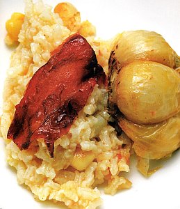 Añadimos un poco de azafrán y pimienta, y si es preciso se rectifica de sal.Debe de cocer a fuego bajo y destapado durante 20 minutos hasta que el arroz esté cocido y haya absorbido el caldo casi del todo, controlando el fuego para que ni quede caldoso ni se seque durante la cocción.