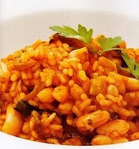 Para cuando esté todo sofrito se echa el arroz para darle una vuelta, y a continuación añadir el agua y las alubias.