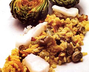 Cortamos las alcachofas y los ajos tiernos, y junto con las habas los sofreimos todo en el mismo aceite que el bacalao.