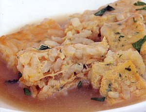 En una cazuela, ponemos el caldo a hervir, y cuando arranque, le añadiremos la tortilla y el embutido cortados, y reduciremos a fuego lento cuando vuelva a hervir.