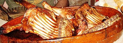 - Con esa pasta se unta la carne por todos los lados, se le añade el vino y se mete en una bandeja al horno, primero fuerte y luego medio.
