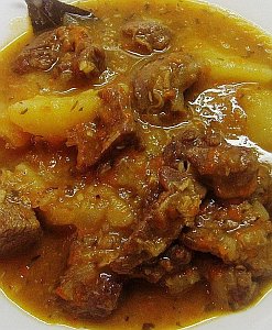 A continuación lo rectificaremos de sal y añadiremos las patatas cortadas a tacos medianos, el vino o brandy, removeremos todo y lo dejaremos de nuevo cocer a fuego lento hasta que estén tiernas las patatas (35 a 45 minutos según variedad y tamaño de los tacos).