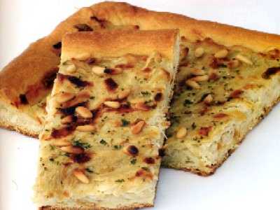 Pondremos el horno a calentar, y mientras lo hace, colocaremos la masa sobre una llanda engrasada, y extenderemos sobre ella la cebolla, los huevos bien batidos y los piñones.