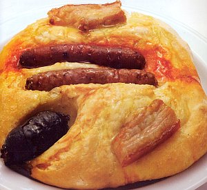 Si se prefiere, puede hacerse en cuatro tortas cortando el embutido, o todo en una si cabe bien en nuestro horno, o extenderla cuadrada en la forma de la propia bandeja del horno para aprovechar mas el espacio.