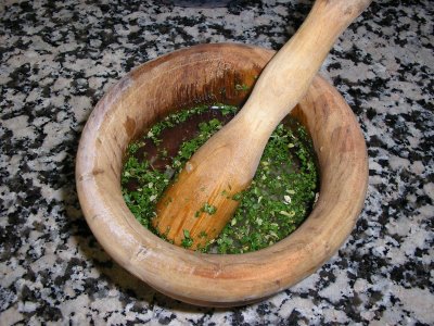 - Se pican todos los ingredientes en un mortero, y se vierten al guiso en el último momento de la cocción, procurando que no hierva mucho.