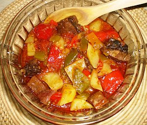 - Cortar y trocear los pimientos y la berenjena pochándolo a fuego medio en el mismo caldero que vamos a cocinarlo.