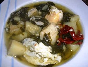 Añadimos a continuación un huevo crudo entero por comensal, para que se hagan sobre el conjunto, quedando como escalfados, y se cuecen mas o menos según el gusto.