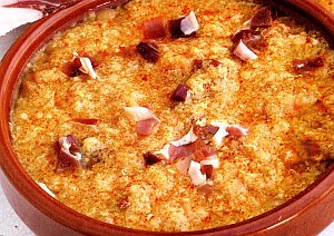 En una cazuela de barro doraremos en aceite caliente, a fuego medio, los dientes de ajo fileteados junto con el jamón serrano cortado a taquitos.