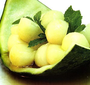 Servimos en cada plato una porción de la carcasa del melón y repartimos sobre todas ellas las bolitas de pulpa macerada, regando luego por encima todo con la mistela de la maceración.