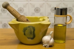 Importante: Los verdaderos utensilios para hacer el "all i oli" son los de la fotografía. Mortero de barro y mano de madera.