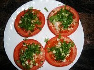 - Se parten los tomates por la mitad , se cortan a trocitos los ajos y el perejil y se pone por encima de los tomates.