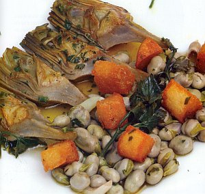 En una cazuela de barro adecuada, pondremos las alcachofas sacándolas del agua y sin secarlas, las habas, la menta, un chorrito de aceite de oliva y un poco de sal.
