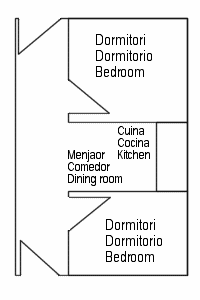 Al atravesar la entrada nos encontrábamos con un largo pasillo, de una anchura aproximada de algo menos de la mitad de su fachada, que daba a otra puerta trasera. En esta zona se encontraba tanto la cocina como una zona de almacenaje de aperos de labranza o de pesca, según el trabajo de sus propietarios. En la otra mitad de la planta se podían encontrar las habitaciones (dos o tres) y una zona de comedor, y tal vez alguna alacena.