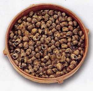 1. Limpiamos y engañamos los caracoles, poniéndolos en una cazuela con agua poco tibia si puede ser al sol, y con los bordes llenos de sal para que no se salgan.