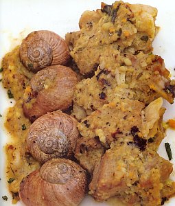 5. Cuando la carne esté casi en su punto, añadimos los caracoles y la picada, y mezclamos todo bien.