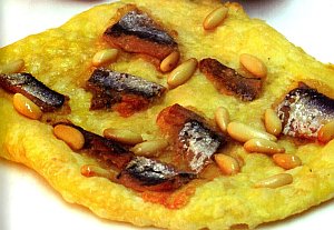 Coca de anxoes i pinyons, torta de anchoas y piñones