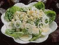 11. Justo antes de servir, incorporaremos la mayonesa y mezclaremos con cuidado, colocaremos la ensalada sobre hojas de lechuga y adornaremos con un huevo picado, y el otro cortado en rodajas.