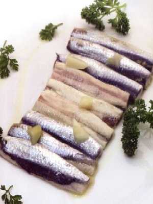 4. Cuando haya pasado ese tiempo, sacamos los boquerones de la fuente, y sin enjuagarlos los ponemos en otra mas pequeña sin la cebolla, les ponemos por encima los ajos cortados pequeños, espolvoreamos el peregil cortado muy pequeño y lo cubrimos de aceite.