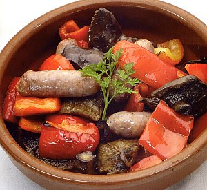 3. En una cazuela de barro sofreimos a fuego medio los pimientos, y cuando empiecen a estar tiernos añadimos las longanizas cortadas a trozos, cociendo todo hasta que esté dorado.