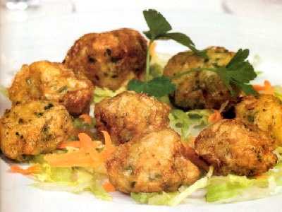 4. Pondremos en un bol las patatas cocidas, el bacalao bien desmigado, un huevo, los ajos majados, una cucharadita de peregil, una cucharadita de nuez moscada molida, un puñado de piñones, un poco de aceite, un poquito de caldo de la cocción, y sal.