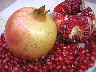 La fruta del granado (Punica Granatum), árbol de familia de las punicáceas, que se encuentra en estado silvestre desde la península de los Balcanes hasta el Himalaya, pero se cultiva como frutal desde la más remota antigüedad y hoy se halla en casi todos los territorios tropicales y subtropicales, en toda la región mediterránea. Sur de Asia, Australia y América.