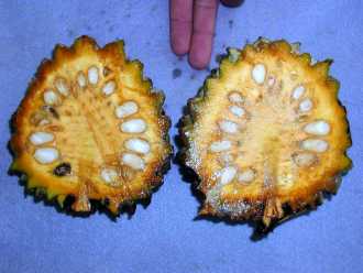 El fruto es alargado, de 15-20 cm. De diámetro y de peso aproximado de uno o más kilos; la piel es gruesa, rojiza o grisáceo-parduzca, provista de protuberancias cónicas que terminan en breves aguijones.